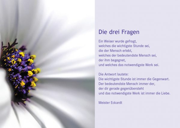 12,00 € – 14,50 €Lebensweisheiten und Sprüche: Postkarten-Set mit 10 unterschiedlichen Karten enthaltene Motive: 208, 209, 213, 225, 226, 227, 233, 234, 235, 236 Auch erhältlich in einer Metallbox für zusätzlich 2,50 Euro mehr Lebensweisheiten und Sprüche unter geschichtenkarten.de oder unter www.hospiz-verlag.de